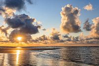 De ondergaande zon wordt weerspiegeld in het water van de Noordzee op het Oost-Friese eiland Juist, Duitsland.
