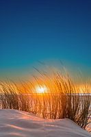 Strandgras bij zonsondergang op het strand van Juist, Oost-Friese eilanden, Duitsland.