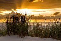 Strandgras voor de zonsondergang over het strand op het Noordzee-eiland Juist in Noord-Friesland, Duitsland, Europa.