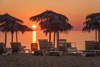 Een prachtige zonsondergang op het strand van Petra op het Griekse eiland Lesbos. Op het strand de strandstoelen en parasols van Beachbar Cavo Christo.