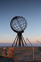 Een prachtige zonsondergang bij het monument op de Noordkaap in Noorwegen. De Globe in het mooie avondlicht aan het eind van het vaste land van Europa. Hoe mooi is dat.
