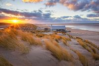 Het licht schijnt heel mooi als een gouden gloed over het helmgras en over de duinen.