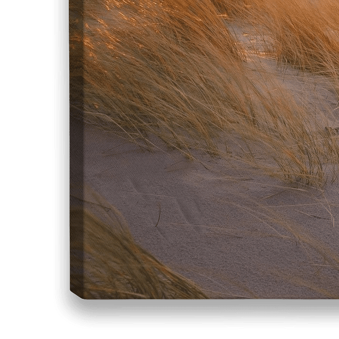 Het licht schijnt heel mooi als een gouden gloed over het helmgras en over de duinen.