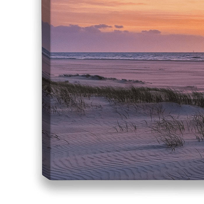 Zonsondergang in de duinen op het noordzeestrand aan de noordkant van het Nederlandse Waddeneiland Vlieland, gemaakt tijdens een mooie voorjaarsavond.