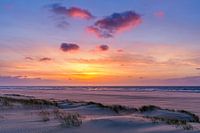 Zonsondergang in de duinen op het noordzeestrand aan de noordkant van het Nederlandse Waddeneiland Vlieland, gemaakt tijdens een mooie voorjaarsavond.