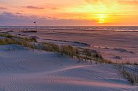 Zonsondergang in de duinen op het noordzeestrand aan de noordkant van het Nederlandse Waddeneiland Vlieland, gemaakt tijdens een mooie voorjaarsavond.