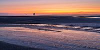 Een 2:1 foto van een zonsondergang bij de nieuwe Wadpost van Staatsbosbeheer, “De Kalkman" (ook wel Drenkelingenhuisje genoemd) op de Engelsmanplaat, een zandplaat gelegen tussen de Waddeneilanden Ameland en Schiermonnikoog en alleen toegankelijk bij Eb.