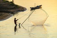 Een eenzame visser staat aan de oever van de majestueuze Mekong in Laos, gehuld in de warme kleuren van de ondergaande zon. De avondzon baadt de hemel in een rijke oranje kleur, die in fonkelend goud wordt weerspiegeld op het spiegelgladde oppervlak van de Mekong. Een poëtisch schouwspel dat de ziel raakt.