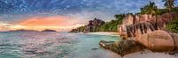 Panoramafoto van het strand Source Dargent met imposante granieten stenen in de warme zonsondergang.