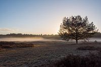 De avondmist kwam verrassend snel op, waardoor de ondergaande zon nog mooier werd. De foto is genomen bij Planken Wambuis op de Veluwe bij Ede.