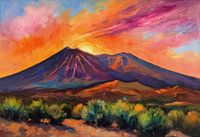 Goudkleurig licht overspoelt de ruige hellingen van de berg Teide, overlopend in schakeringen van oranje, roze en diep violet als de dag vervaagt. De impressionistische streken van de kunstenaar vangen de vulkanische texturen en de stilte van de schemering - een prachtig eerbetoon aan de iconische top van Tenerife.