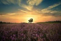 De zon gaat onder precies achter een eenzame boom op een paars heideveld.