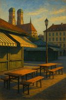 Dit charmante en suggestieve schilderij legt een zeldzaam moment van stilte vast op de drukke Viktualienmarkt in München. Het tafereel toont de markt nadat de menigte zich heeft teruggetrokken, met de iconische groene houten kraampjes en gestreepte luifels gesloten voor de avond. Op de voorgrond gloeien lege biertuintafels en banken op…