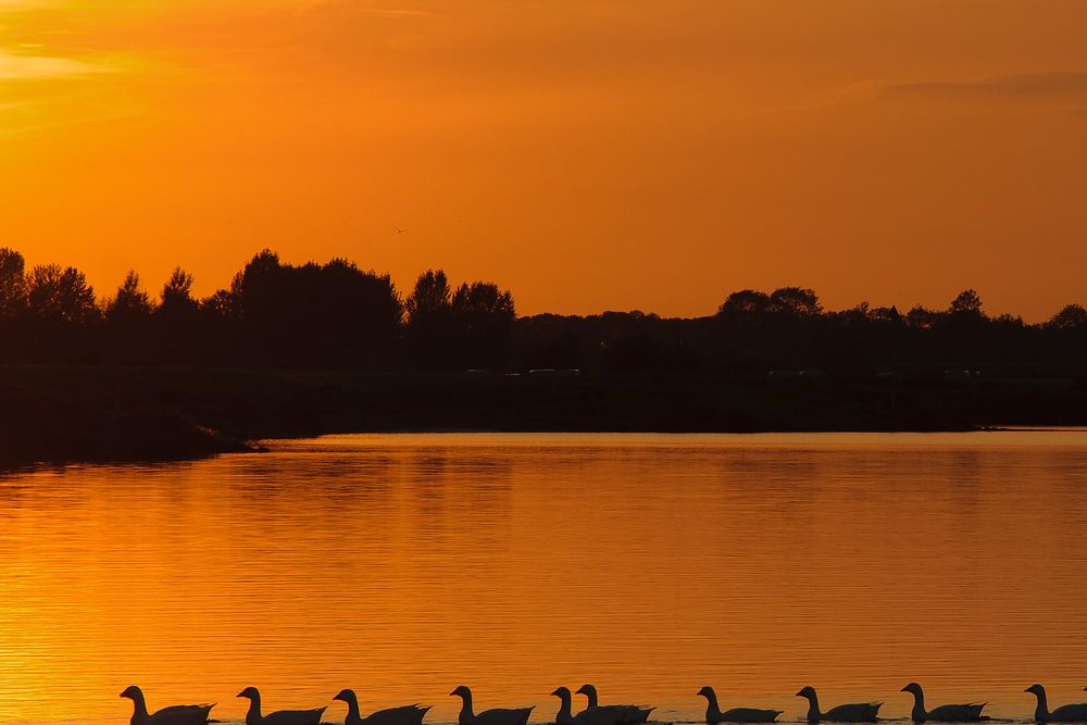 14 ganzen op een rij, bijna perfect achter elkaar aan zwemmend, windstil, de zon op de juiste plaats én in het gouden uur. Ik had mijn camera bij de hand, dus even fotograferen natuurlijk..
