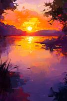 Een schitterend schouwspel van kleuren ontvouwt zich aan de horizon als de zon zachtjes in het water zakt. De reflecterende golven vangen het warme licht, omringd door silhouetten van bomen. Dit kunstwerk brengt een gevoel van rust en vrede, ideaal voor een woonkamer waar het aanzet tot ontspannende momenten en zorgt voor conversatie.