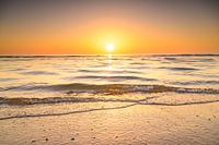 Zonsondergang op het Noordzeestrand tijdens een rustige dag in Zuid-Holland met zachte golven die tegen het zandstrand slaan.