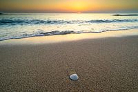 Zonsondergang op het Noordzeestrand tijdens een rustige dag in Zuid-Holland met zachte golven die tegen het zandstrand slaan. Een enkele schelp ligt op het zand.