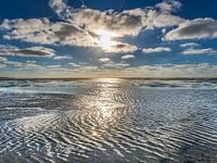 Zonsondergang op een zomeravond op het wad op de pier bij Paesens Moddergat en de zon reflecterend in het water.