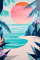Zachte pastelkleuren omhelzen de horizon terwijl de zon zachtjes in zee zakt. Palmbomen nodigen je uit om te dromen en de golven ruisen verhalen van verre stranden. Dit artistieke panorama geeft elke woonkamer een ontspannen vakantiesfeer en brengt een stukje kustflair direct in huis. Ideaal voor grenzeloze reislust!