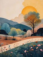 Een schilderachtige zonsondergang die de landelijke horizon oplicht in warme, gouden en oranje tinten.