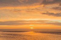 Kleurrijke zonsondergang op het Noordzeestrand van het eiland Schiermonnikoog in het Nederlandse Waddengebied aan het eind van de dag. Schiermonnikoog maakt deel uit van de Friese Waddeneilanden en staat bekend om zijn prachtige natuur, waaronder zandstranden, glooiende duinen en weelderige wetlands.