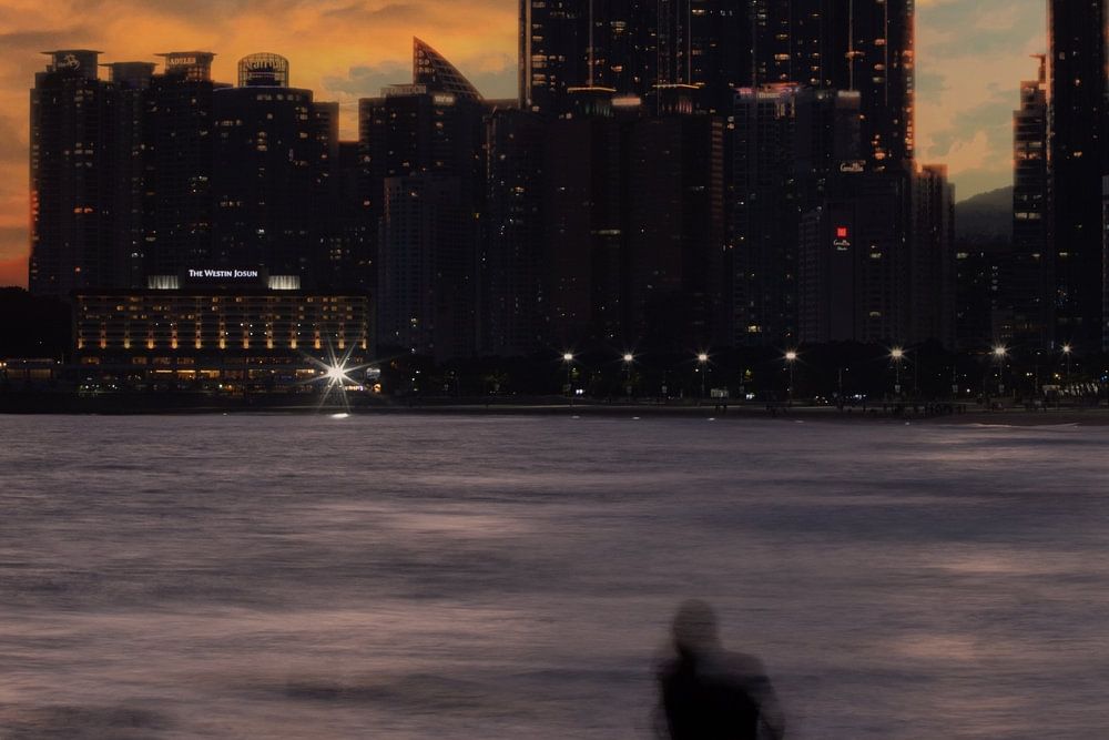 Zonsondergang op het strand in Busan, Zuid-Korea