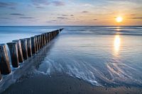 Op een rustige avond gaat de zon onder bij het strand op Ameland, vlakbij Beachclub The Sunset. Het water is kalm en sereen. De rij met palen lijkt bijna oneindig en trekt je zo het beeld in.