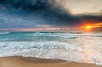 Zonsondergang achter een donkere wolkenlucht boven de Atlantische Oceaan (Golf van Biskaje) aan het strand van Le Truc Vert gelegen op het Franse schiereiland Cap Ferret. Deze foto is gemaakt in de Zomer van 2018