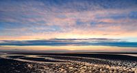Kleurrijke zonsondergang op het Noordzeestrand van het eiland Schiermonnikoog in het Nederlandse Waddengebied aan het eind van de dag. Schiermonnikoog maakt deel uit van de Friese Waddeneilanden en staat bekend om zijn prachtige natuur, waaronder zandstranden, glooiende duinen en weelderige wetlands.