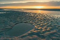 Kleurrijke zonsondergang op het Noordzeestrand van het eiland Schiermonnikoog in het Nederlandse Waddengebied aan het eind van de dag. Schiermonnikoog maakt deel uit van de Friese Waddeneilanden en staat bekend om zijn prachtige natuur, waaronder zandstranden, glooiende duinen en weelderige wetlands.