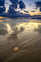 Zonsondergang met dramatische wolkenpartijen op het strand van Texel met een aangespoelde schelp op de voorgrond tijdens een mooie herfstdag op het Waddeneiland.