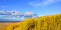 Zonsondergang op het strand van Texel met zandduinen op de voorgrond tijdens een mooie dag op het Waddeneiland in Noord-Holland. Kleurrijke wolken drijven binnen vanaf de Noordzee over het strand.