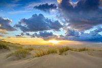Zonsondergang op het strand van Texel met zandduinen op de voorgrond tijdens een mooie dag op het Waddeneiland in Noord-Holland. Kleurrijke wolken drijven binnen vanaf de Noordzee over het strand.