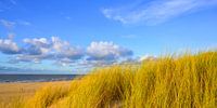 Zonsondergang op het strand van Texel met zandduinen op de voorgrond tijdens een mooie herfstdag aan het Noordzeestrand op het Waddeneiland.