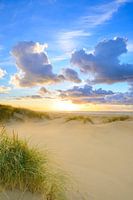 Zonsondergang op het strand van Texel met zandduinen op de voorgrond tijdens een mooie herfstdag op het Waddeneiland.