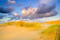 Zonsondergang op het strand van Texel met zandduinen op de voorgrond tijdens een mooie herfstdag op het Waddeneiland.