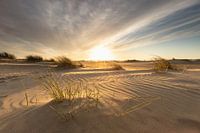 Zonsondergang op het strand van Zeeland tijdens het gouden uurtje. Helmgras, stuifzand en een mooie wolken lucht vlak voor de zonsondergang.