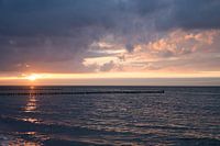 Zonsondergang op het strand van Zingst. Romantische avondsfeer. De kribben reiken tot in de zee. Landschapsfoto aan zee