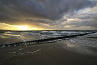 Zonsondergang op het strand van Zingst. Romantische avondsfeer. De kribben reiken tot in de zee. Landschapsopname bij de zee