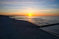 Zonsondergang op het strand van Zingst. Romantische avondsfeer. De kribben reiken tot in de zee. Landschapsopname bij de zee