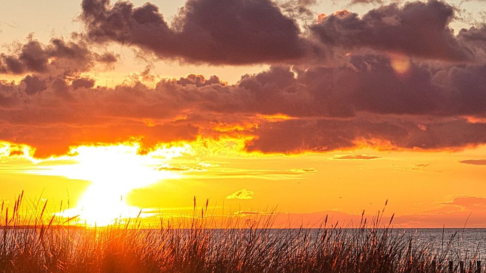 Zonsondergang op het strand van Zingst. Romantische avondsfeer. Wolken verlicht door het zonlicht aan de kust. Landschapsopname aan zee