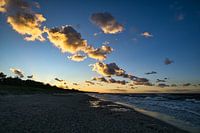 Zonsondergang op het strand van Zingst. Romantische avondsfeer. Wolken verlicht door het zonlicht aan de kust. Landschapsopname aan zee