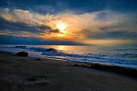 Zonsondergang op het strand van Zingst. Romantische avondsfeer. Wolken verlicht door het zonlicht aan de kust. Landschapsopname aan zee