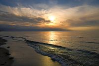 Zonsondergang op het strand van de Baltische Zee. Romantische avondsfeer. Water verlicht door zonlicht aan de kust. Landschap gefotografeerd aan zee
