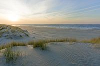 Foto van strand en duinen met ondergaande zon langs de Nederlandse kust bij Ouddorp, Zuid-Holland. De Duinen van Goeree is een natuurgebied op Goeree-Overflakkee.