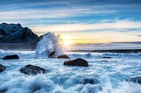Zonsondergang op het strand van Unstad in Noorwegen