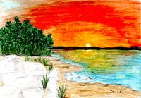 Dit aquarelschilderij toont een kleurrijke zonsondergang aan het strand in Holnis bij Glücksburg
