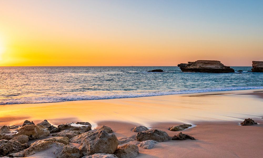 Zandstrand met rotsen in het licht van een laagstaande zon
