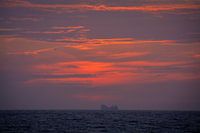 Een zonsondergang op zee, gezien vanaf de kust bij de Maasvlakte. Met prachtige rood oranje kleuren en rustige wolken. Een schip aan de horizon en een paar meeuwen in de lucht maken het plaatje compleet.