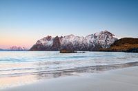Zonsondergang over Hovden strand in de Vesteralen-archipel in Noord Noorwegen tijdens een mooie de winterdag in de noordpoolcirkel.